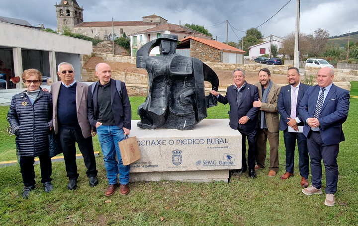 Posan junto a la escultura en homenaje al médico rural Carmina Camarero, viuda del médico de Laza homenajeado Fernando Jiménez; José Manuel Solla, director del Museo do Médico Rural; Roberto Fernández, médico en Allariz y escritor; Julio Ancochea, presidente de Asomega; José Manuel Solla, médico en Allariz y ex presidente de SEMG; Albert Foo, médico en Laza y presidente de SEMG Galicia; y José Ramón Barreal, alcalde de Laza.