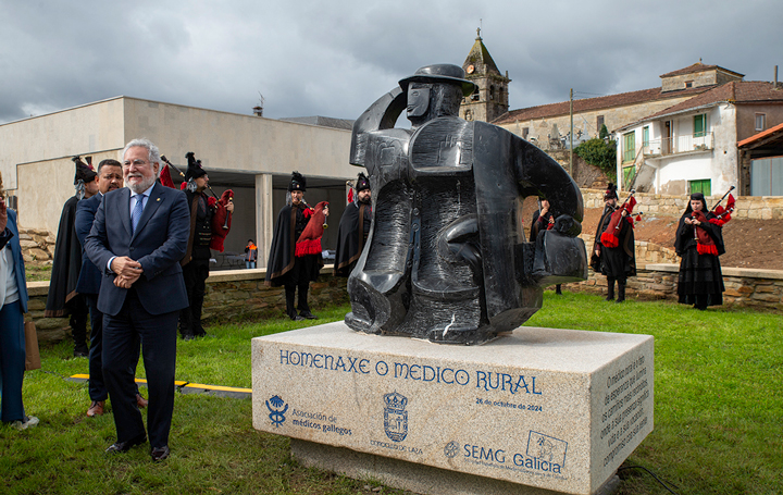 El último bloque del acto tuvo lugar a escasos metros del Concello, en la explanada donde Laza acaba de inaugurar su centro de mando de la Unidad de Protección Civil y Emerxencias. En ese espacio se descubrió una estatua en homenaje al médico rural obra del escultor Arturo Andrade, acto en el que participó el presidente del Parlamento de Galicia, Miguel Santalices. La Real Banda de Gaitas de la Deputación de Ourense puso el punto final a este especial y emotivo evento.