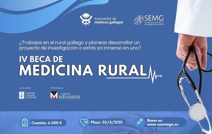 La Asociación de Médicos Gallegos (Asomega) y la Sociedad Española de Médicos Generales y de Familia de Galicia (SEMG) presentan una nueva edición de su Beca de Medicina Rural, iniciativa que busca proyectos innovadores en el ámbito de la asistencia sanitaria rural en Galicia y para la que vuelven a contar con la colaboración de Menarini. Con una dotación de 6.000 euros, se dirige a médicos de Atención Primaria comprometidos con la mejora de la salud en poblaciones de menos de 10.000 habitantes.