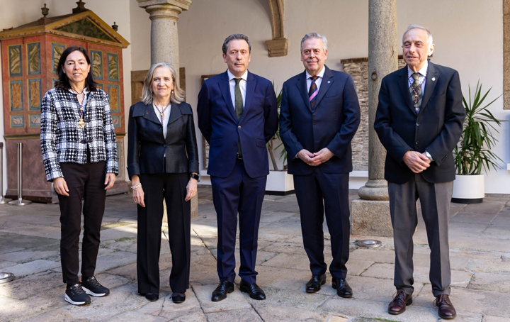 Carmen Álvarez Lorenzo, secretaria de la Real Academia Galega de Farmacia; la investigadora María José Alonso; Luis Paz-Ares; el conselleiro de Sanidade, Antonio Gómez-Caamaño; y el presidente de la Academia, Ángel Concheiro.