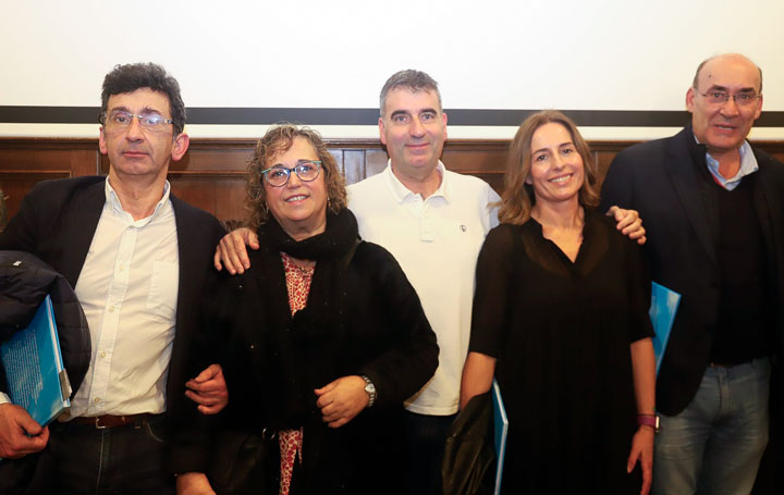El poeta acompañado por varios asistentes al acto, entre ellos el miembro de Asomega Francisco Javier González Barcala (a la izquierda).