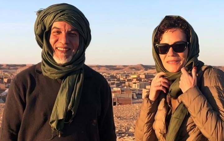 Julio Ancochea, presidente de Asomega, y Ruth Campos, vicerrectora de Compromiso Social y Cultura de la UAM y socia de Asomega. A la izquierda, frente a la Casa de Galicia en Bojador. A la derecha, en el Parlamento de la República Árabe Saharaui Democrática (RASD).