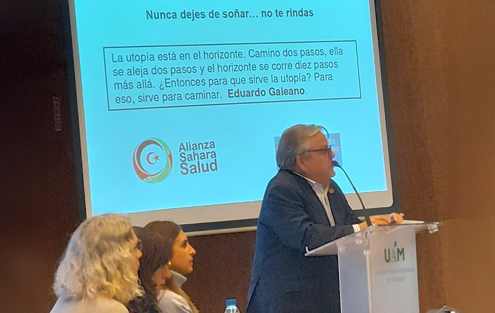 En primer lugar, quiero dar las gracias a Julio Ancochea por su ejemplar solidaridad en todos los ámbitos desde los cuales trabaja. Su apoyo, en concreto, a la población saharaui, es máxima desde hace muchos años. Ha viajado en numerosas ocasiones a los campamentos y ha creado la Alianza Sahara Salud en la que se inscribe este proyecto y que ha permitido una red de actores muy diversos relacionados con el campo de la salud que apoyan la mejora de la misma entre la población saharaui. Ha sido un trabajo ejemplar de compromiso.